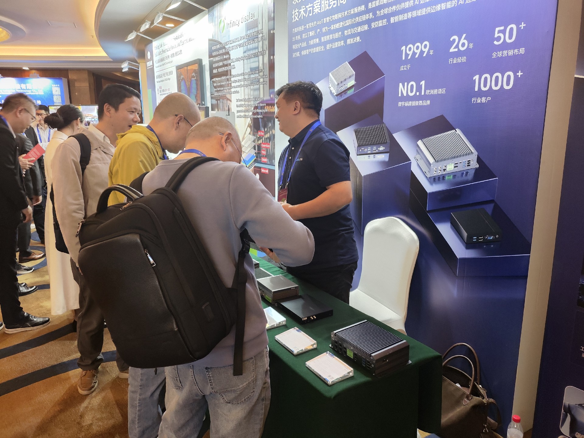 在产品技术体验区,杰和科技展台吸引了众多与会者驻足。通过现场部署的AI边缘计算盒与嵌入式硬件,来宾亲身体验了其在智慧零售、高清数字标牌、多功能互动信息亭等场景下的流畅应用与实时智能分析能力,生动印证了其解决方案的成熟度与实用性,获得了现场客户与伙伴的高度认可。