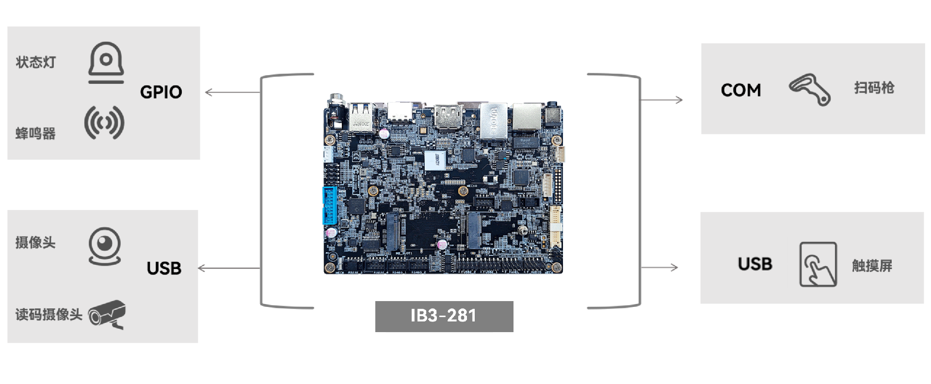 以典型的分拣工作站为例,其流程涵盖扫描称重、自动分拣与末端划包等多个环节。杰和IB3-281作为系统的大脑,通过连接扫码枪、摄像头、称重器等设备,高效协调数据采集与指令执行,显著减少人工干预,降低分拣差错率。