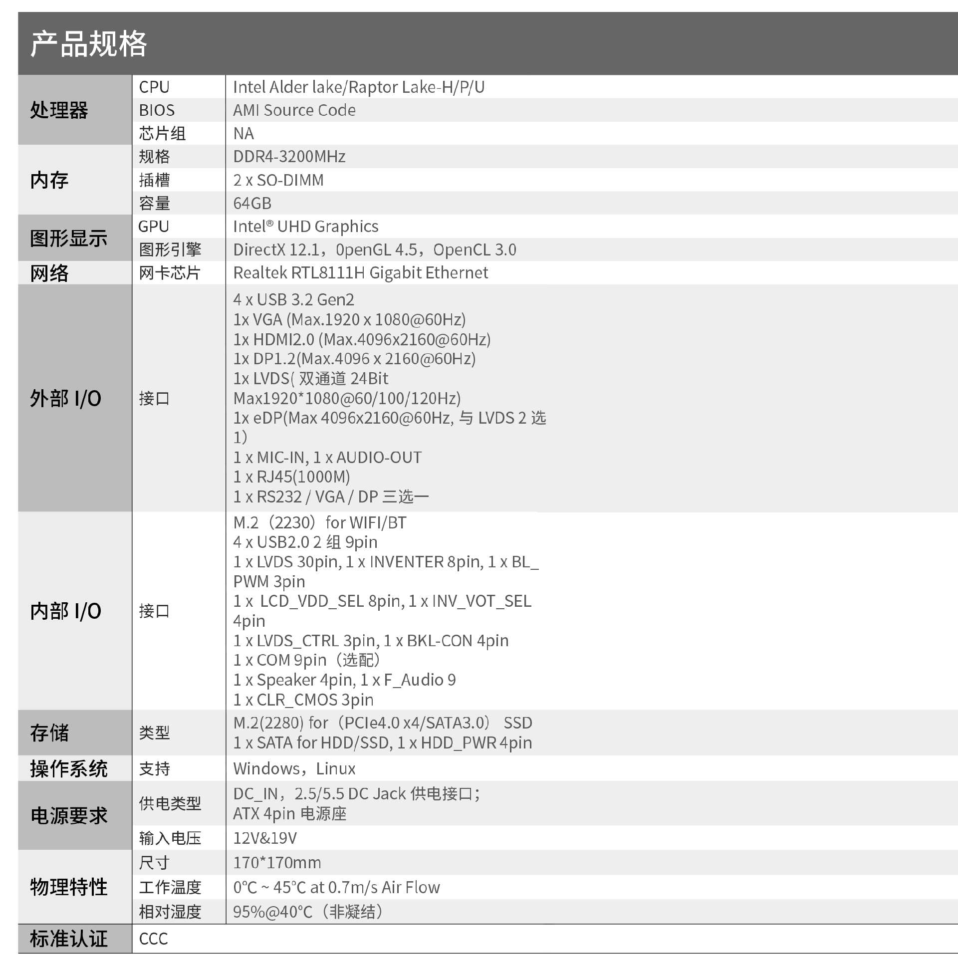 ·支持 Intel Alder/Raptor Lake-H45 平台·2 x DDR4 SO-DIMM,up to 64GB