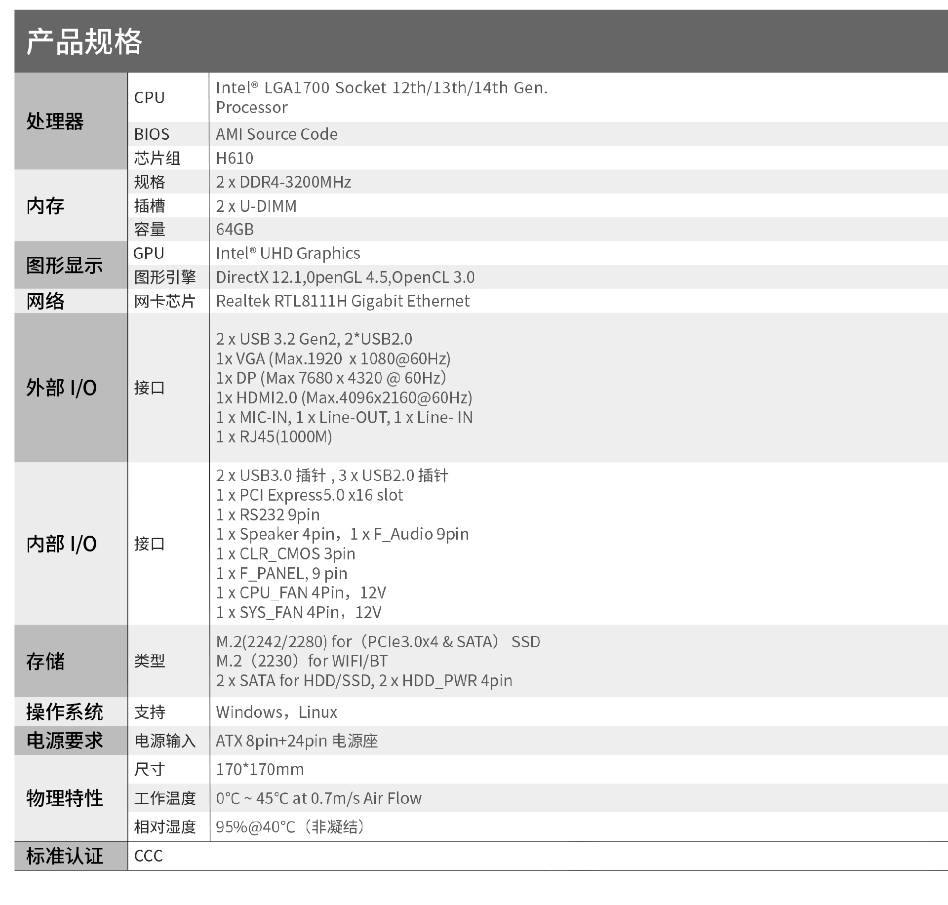 ·支持 Intel Alder Lake/Raptor Lake-S 平台,H610 芯片组·2 x DDR4 SO-DIMM,up to 64GB