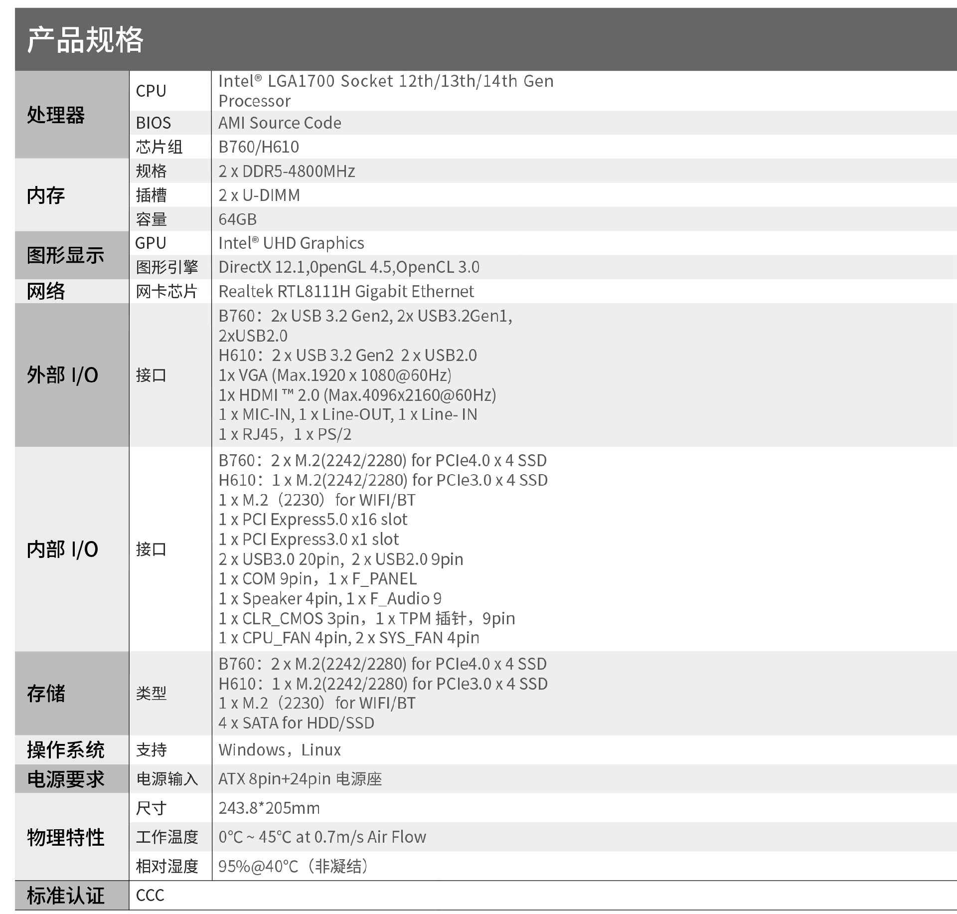 ·支持 Intel Alder Lake/Raptor Lake-S 平台,B760/H610 芯片组 ·2 x DDR5 U-DIMM,up to 64GB ·1 x HDMI ™ 2.0,1 x VGA ·1 x M.2(2242/2280)SSD,4 x SATA3.0 ·1 x M.2(2230) for wifi/BT (支持 CNVI)
