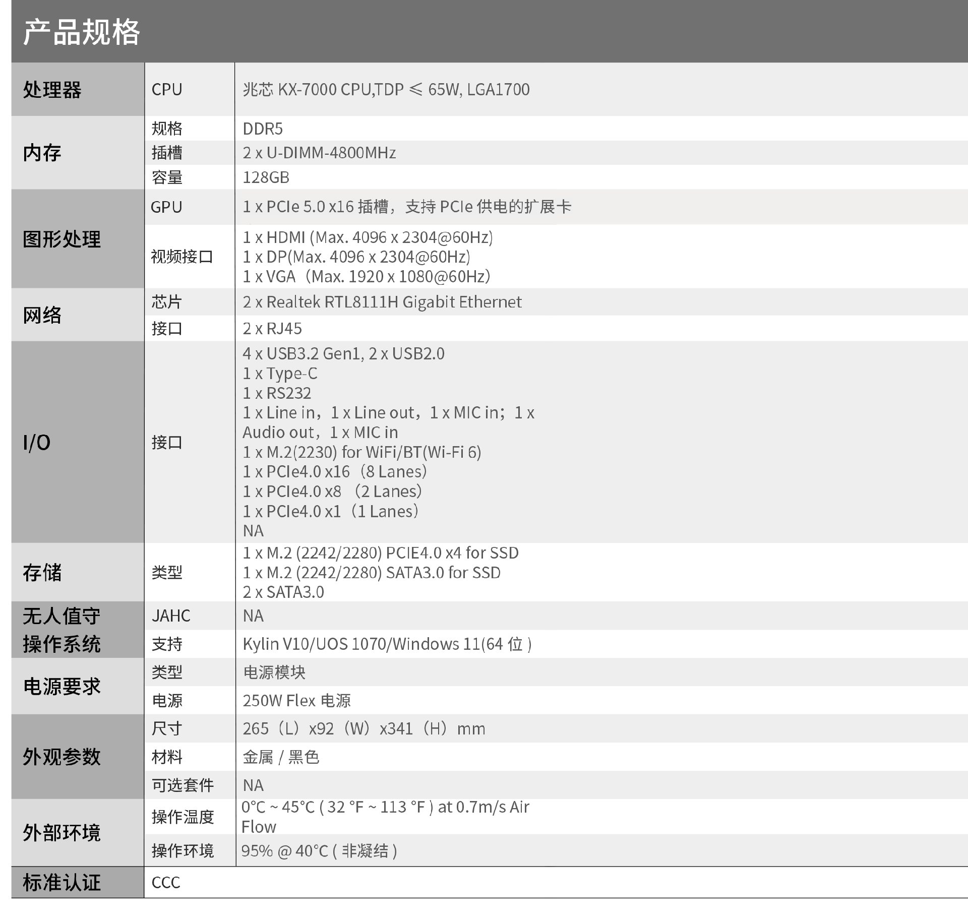 ·采用兆芯 KX-7000 处理器·双通道 U-DIMM DDR5 内存,最大扩展 128GB