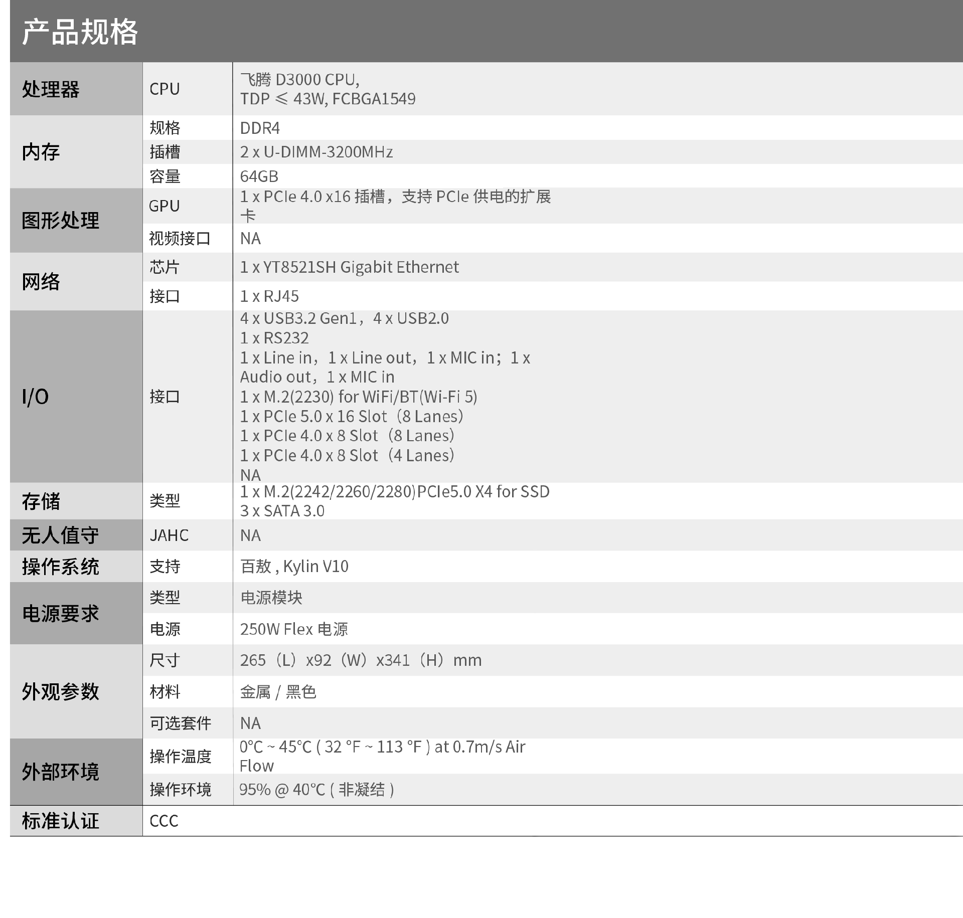 ·采用飞腾 D3000 处理器·双通道 U-DIMM DDR4 内存,最大扩展 64GB