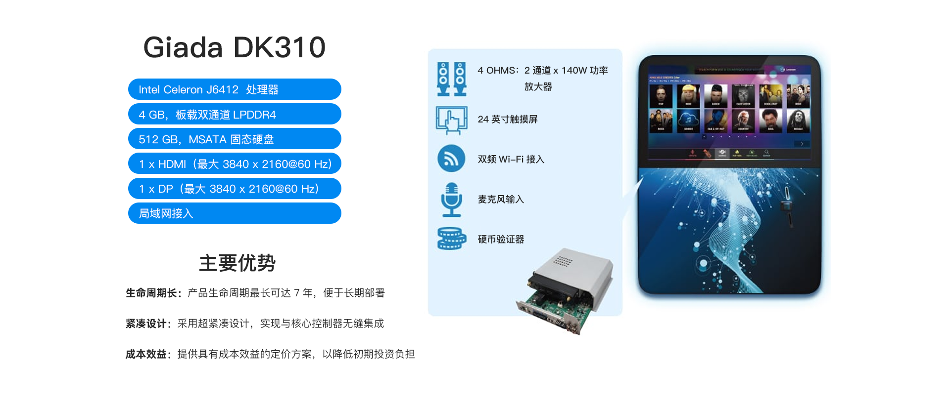 “Giada DK310是我们选择的嵌入式计算机。其紧凑的体 积、长寿命和卓越的性能,使这款产品成为我们最新点唱 机的完美选择。我们的客户可以放心获得卓越的投资回报 。”