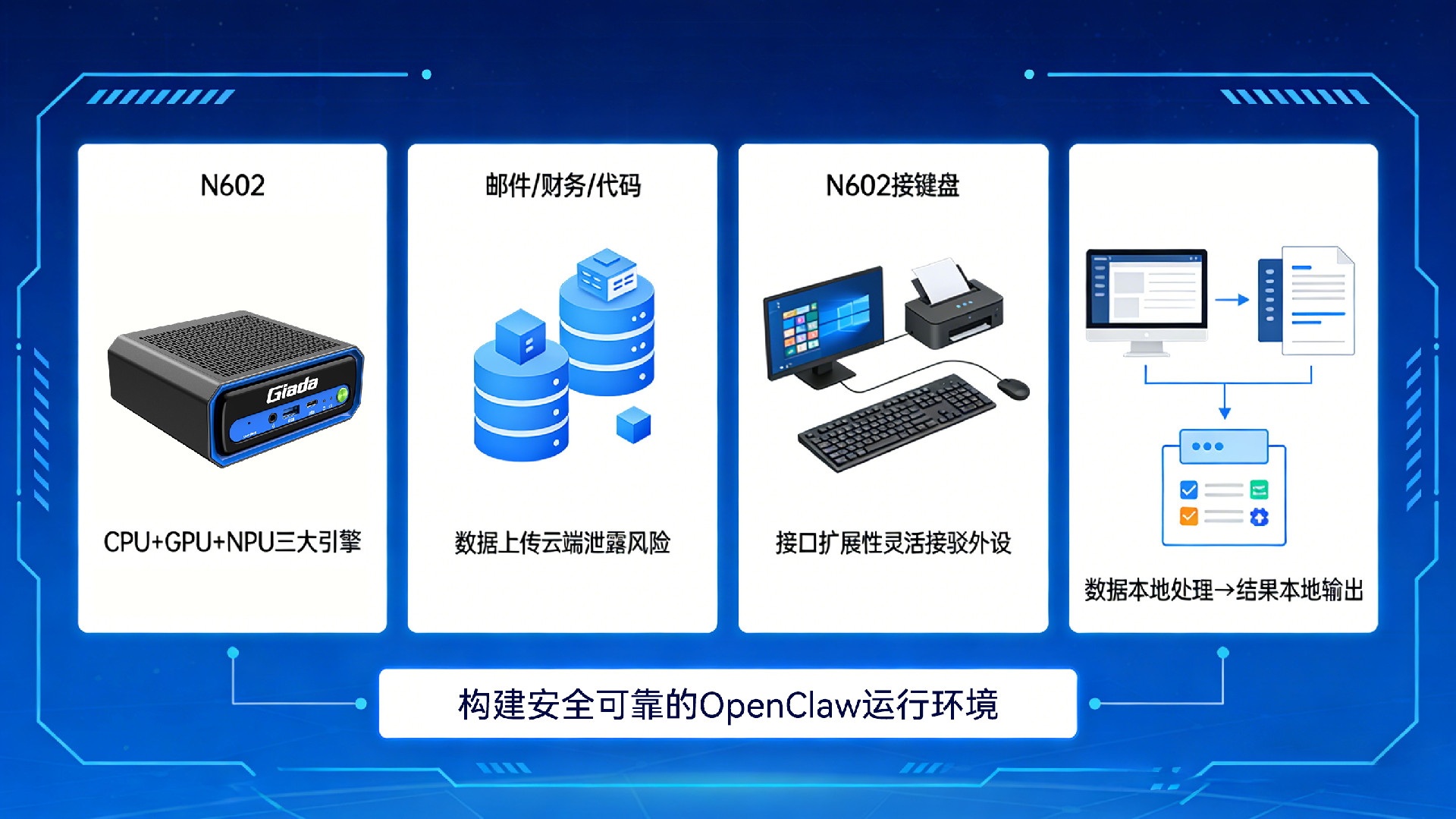 N602凭借其CPU+GPU+NPU三大引擎与接口扩展性,可灵活接驳各类外设并部署轻量化本地模型,使日常任务在设备内部完成闭环,实现数据本地处理、结果本地输出,助你构建安全可靠的OpenClaw运行环境。